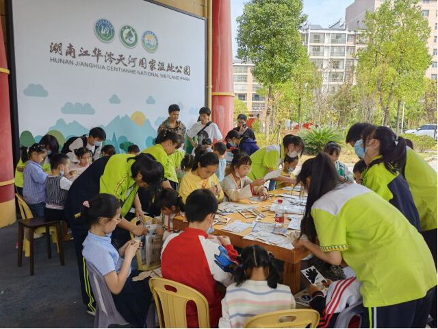 10月23日,湖南省生态环境教育基地——涔天河国家湿地公园科普宣教中心组织“绿色低碳”江华职中服务队志愿者开展“湿地零碳绿色实践”运载火箭科普手工制作活动。