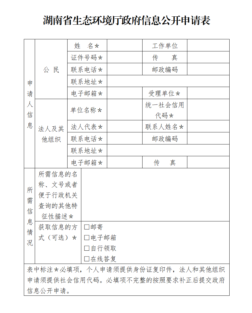 公民、法人或者其他组织向本机关申请公开政府信息,应填写《湖南省生态环境厅政府信息公开申请表》(湖南省生态环境厅政府信息公开申请表),个人提出申请时,请同时提供身份证复印件。法人或其他组织提出申请时,请同时提供组织机构代码证复印件以及营业执照复印件。