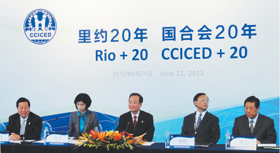 6月21日,环境保护部部长周生贤陪同温家宝总理出席联合国可持续发展大会国合会主题边会。