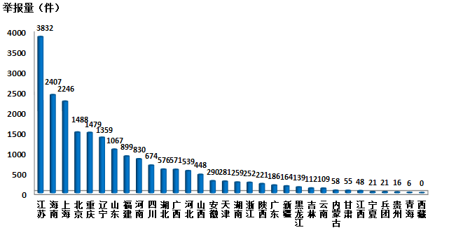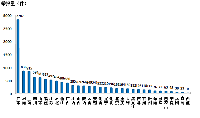 2018年1月,全国共接到网上举报5355件,相比上月减少1210件,环比降低18.4%;相比去年同期增加2518件,同比增长88.7%。其中广东、河南、山东三省公众使用网上举报相对频繁,举报数量合计约占全国总数的33.5%。