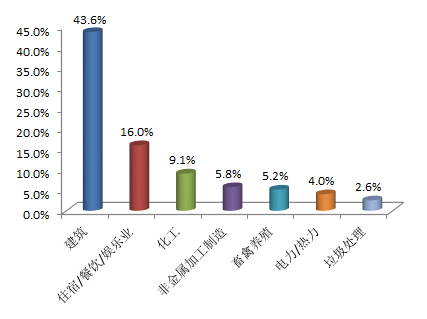 从全国举报情况来看,公众反映最集中的行业是建筑业,占43.6%,主要是夜间施工噪声问题,其次是住宿/餐饮/娱乐业和化工业,分别占16%和9.1%。