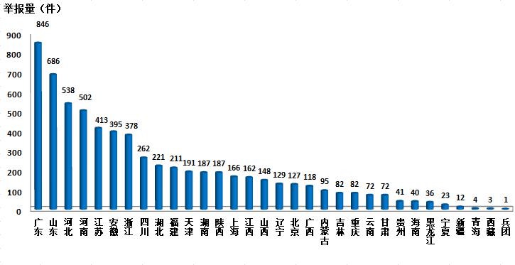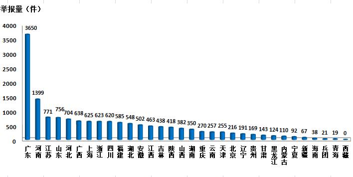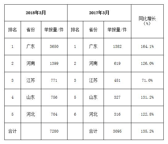 2018年3月,平台共接到网上举报6430件,相比上月增加3626件,环比增长129.3%;相比去年同期增加2126件,同比增长49.4%。其中广东、山东、河南三省公众使用网上举报相对频繁,举报数量合计约占全国总数的31.6%。