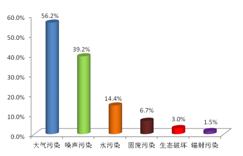 大气污染举报中,反映烟粉尘的举报最多,占涉气举报的41.8%,其次为恶臭/异味及工业废气的举报,分别占涉气举报的41.4%和27.1%。噪声污染举报中,反映建设施工噪声污染的举报最多,占噪声举报的46.5%,其次为反映工业噪声的举报,占29.8%。水污染方面,反映工业废水污染的举报最多,占涉水举报的58.4%。