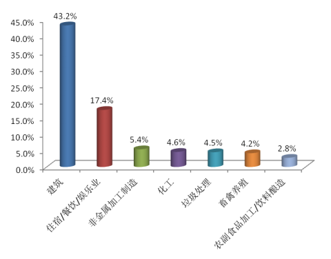 从行业类型来看,本月公众反映最集中的行业是建筑业,占43.2%,相比上月增加11个百分点,其次为住宿餐饮娱乐业和非金属加工制造业,分别占17.4%和5.4%,主要反映问题包括:夜间施工噪声、施工粉尘、餐饮油烟、生活娱乐噪声污染、恶臭污染等。