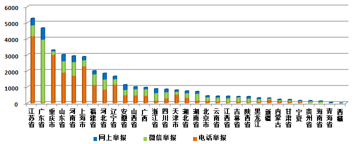 从各地区举报数量看,电话举报量以江苏省为首,微信举报量以广东省为首,江苏、广东、重庆、山东、河南、上海等地总举报量相对较多,六省(市)举报量合计占全国的57.5%。