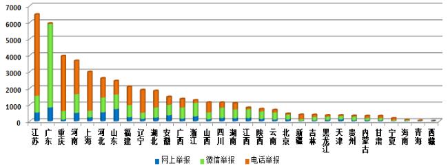 从各地区不同渠道举报数量看,江苏、重庆、河南、上海等地电话举报量较多,广东微信举报占比达85.4%。