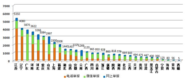 从各地区不同渠道举报数量看,江苏、辽宁、广东、河南、河北、重庆等地举报较为集中,其中重庆、江苏、辽宁等地电话举报占比较高,广东、浙江、陕西等地微信举报占比较高。