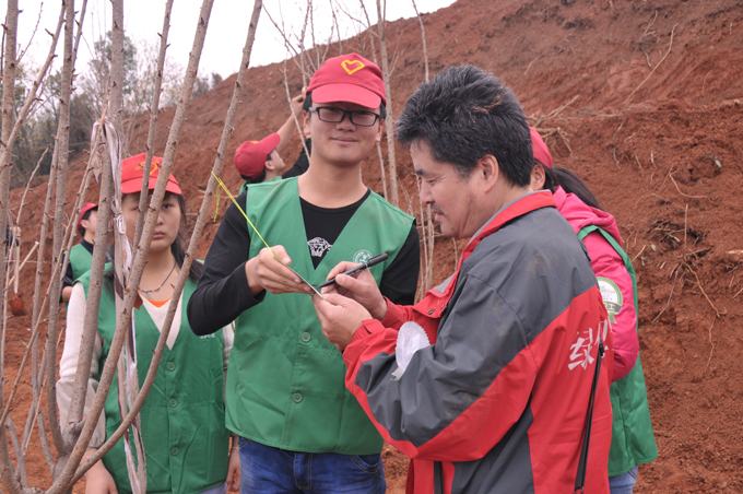 绿色卫士肖力杨与大学生环保志愿者共同写下环保心愿挂在亲手栽种的树上。