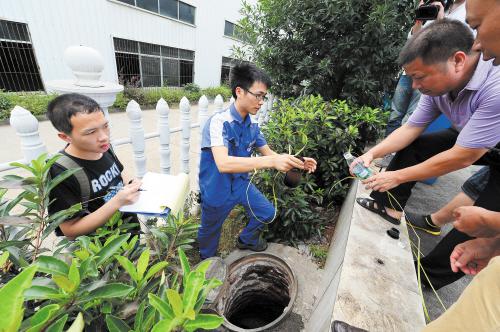 图说:日前,长沙环保执法人员来到星沙某4S店,对该店排放的污水进行抽样检测。