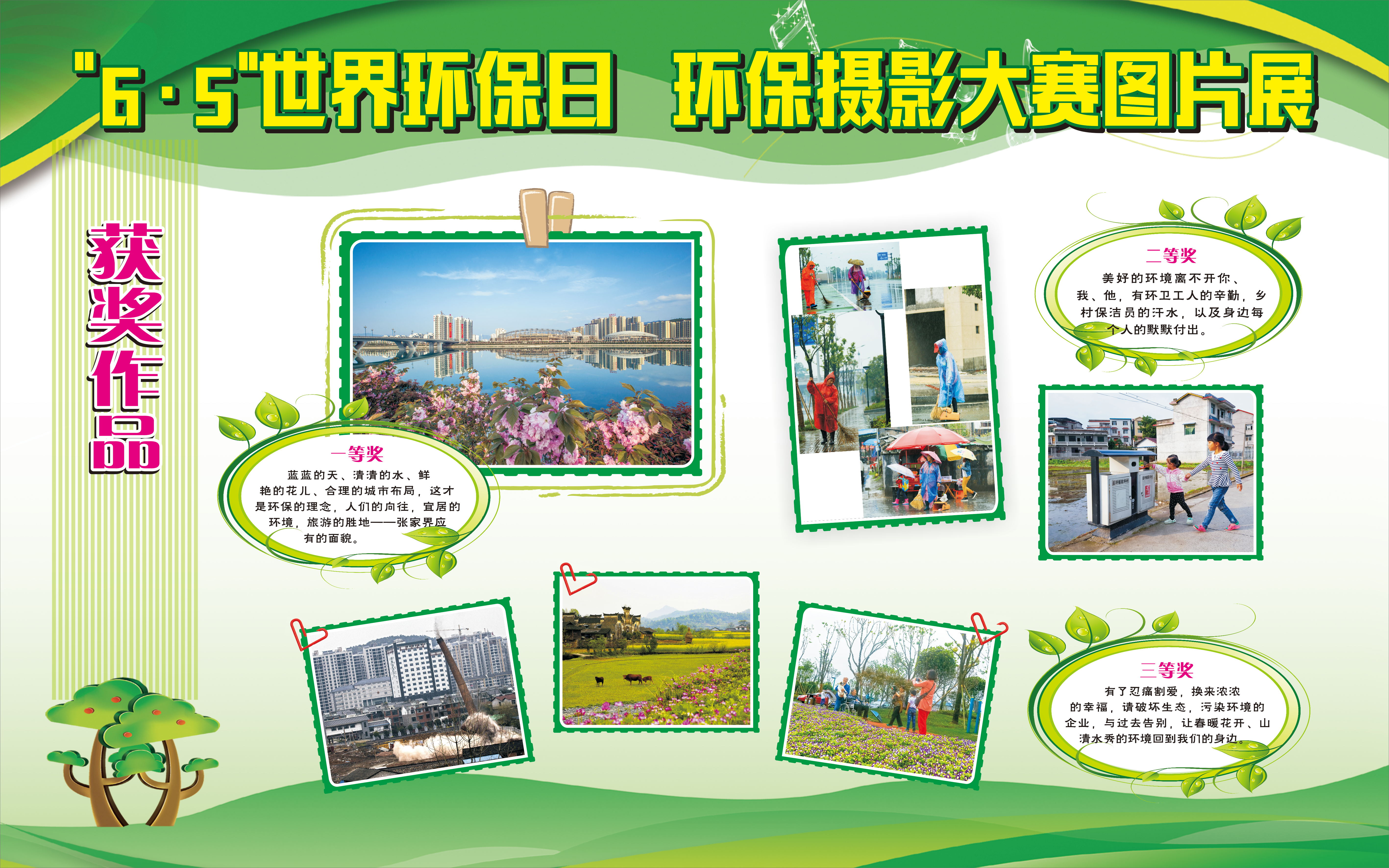 本次摄影展共评选出一等奖一名,二等奖二名,三等奖三名,优秀奖五十名。部分获奖作品将从6月6日开始分别在张家界市区直大院、市区主要街道、以及部分乡镇展出,以鼓励更多的广大市民积极投入到对我市环境保护的行动中来!