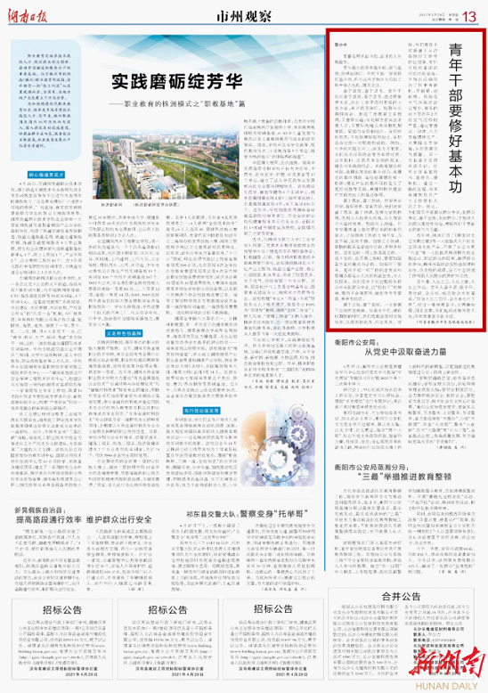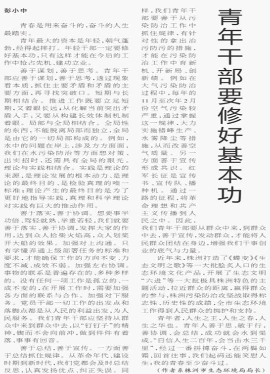 4月29日,株洲市生态环境局党组书记、局长彭小中就即将到来的“五四”青年节,在湖南日报发表一篇名为《青年干部要修好基本功》的署名文章。此文,根据彭小中同志在2021年株洲市生态环境系统青年干部大会上讲话,整理而来。下面,我们来了解一下这篇署名文章。