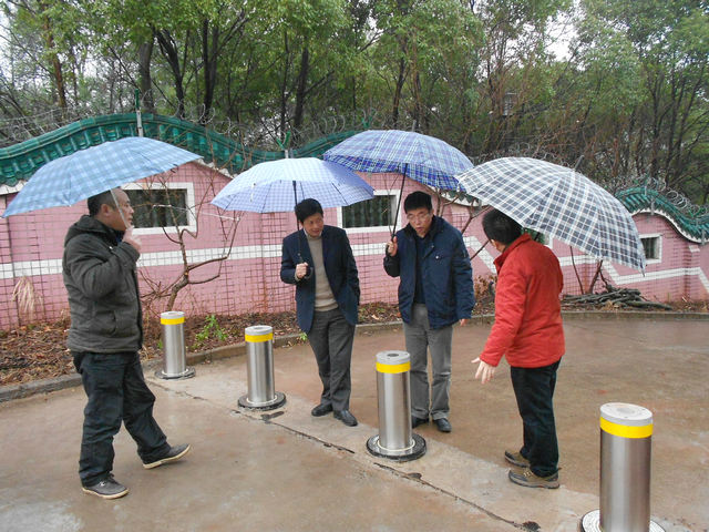 图一:彭翔副厅长、徐勇纪检组长检查确认车辆防撞柱的牢靠程度