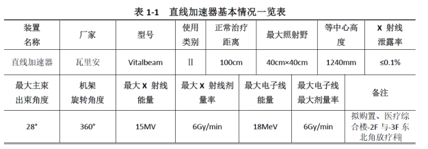 邵阳学院附属第一医院计划在院内新建医疗综合楼(含儿童服务体系)1 栋(邵市环评[2017]43号),拟在该楼-2F与-3F东北角建设直线加速器机房1间,使用瓦里安Vitalbeam V500 型直线加速器1台;在-2F中部区域建设血管造影X射线机机房2间,使用医用血管造影X 射线机(DSA)2台。上述设备均属Ⅱ类射线装置。 本项目总投资为3000万元,其中环保投资为159.29万元,占总投资的5.31%。 |