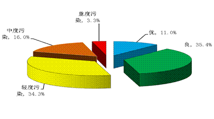 按照《环境空气质量标准》(GB3095-2012),2015年2月份,我省14个市州所在城市环境空气质量达标天数比例范围在32.1%~85.2%之间,平均达标天数比例为46.4%;平均超标天数比例为53.6%,其中轻度污染占34.3%,中度污染占16.0%,重度污染占3.3%。影响城市环境空气质量的主要污染物是细颗粒物(PM2.5)。