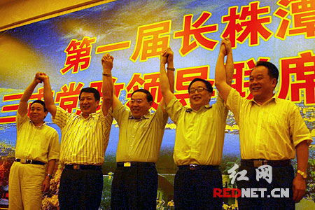 三市党政领导人湖南省委常委、长沙市委书记梅克保(中),长沙市市长谭仲池(左一),株洲市委书记肖雅瑜(右二),株洲市市长颜石生(右一)和湘潭市市长彭宪法(左二)紧紧将手握在一起,高举过头顶。