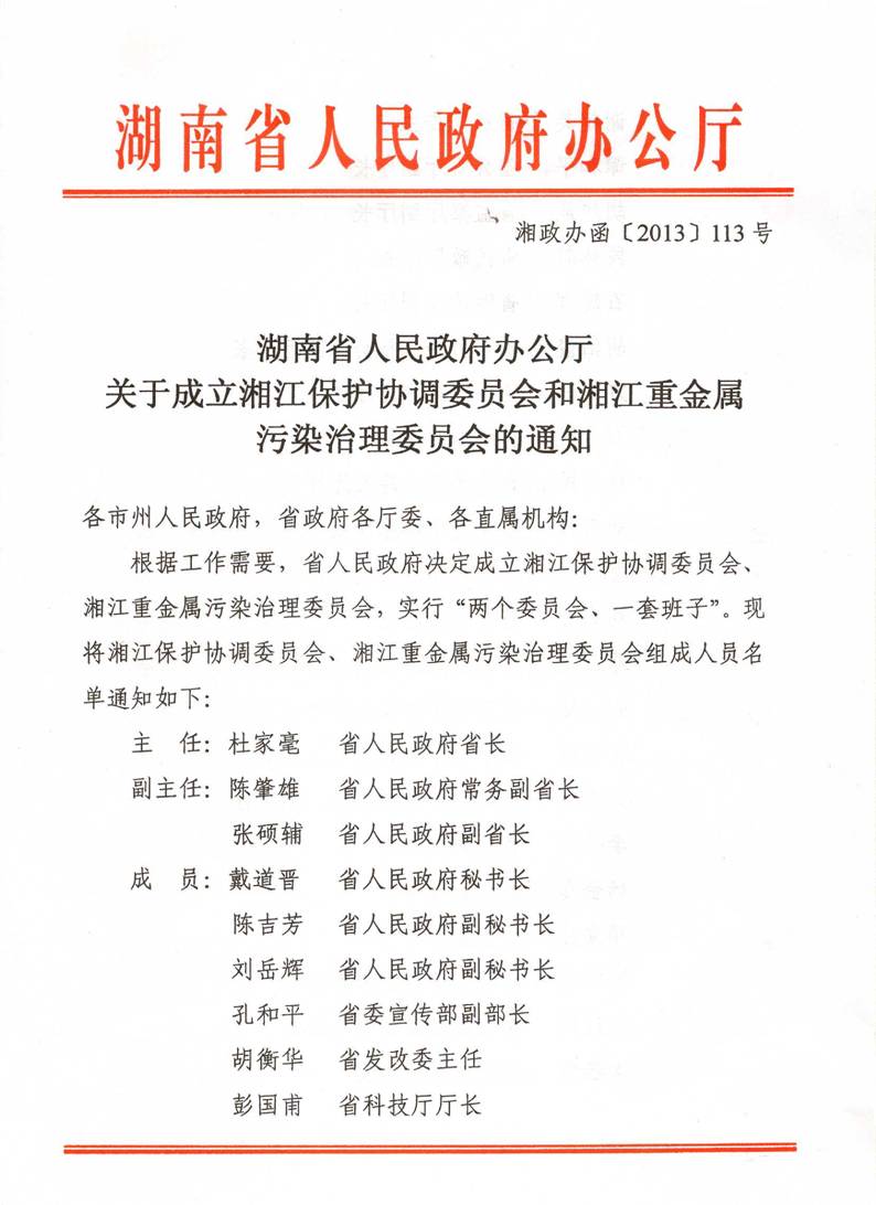 关于成立湘江保护协调委员会和湘江重金属污染治理委员会的通知