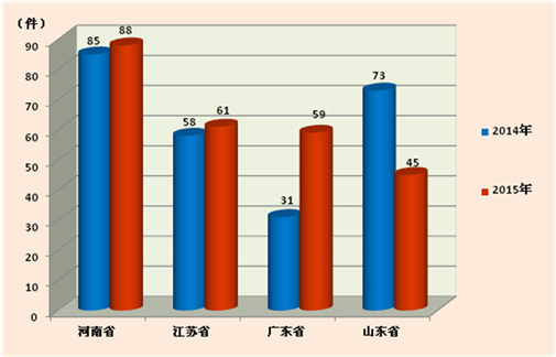 从地区分布来看,中东部地区举报集中。2015年1-6月举报数量前四位的省份是:河南(88件)、江苏(61件)、广东(59件)、山东(45件),四省举报量之和占全国的36.4%。相比2014年同期,河南、江苏两省举报量基本持平,广东省举报量上升了90.3%,山东省举报量下降了38.4%。