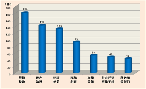 2015年1-6月,环境保护部“12369”环保举报热线受理群众举报696件,与2014年同比持平,其中涉及大气污染的举报540件、涉及水污染的226件、涉及噪声污染的165件、涉及固体废弃物的48件、涉及项目审批的10件,目前已全部办结,按期结案率100%。经各地环保部门查处,举报件中存在环境违法问题的有497件,占举报总数的71.4%,有199件未发现群众反映的问题,占总数的28.6%。各地环保部门已对这些环境违法行为依法进行了处理,其中责令限期整改181件、停产治理143件、处以罚款133件、现场予以纠正93件、取缔关闭53件、补办环评手续48件、移交相关部门处理43件。目前,这些处理措施已得到较好的落实。